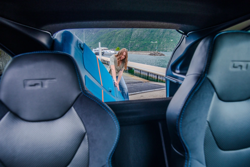 | Sellerie "GT" tri-matière avec surpiqures bleues et logo GT embossé sur appuie-tête |